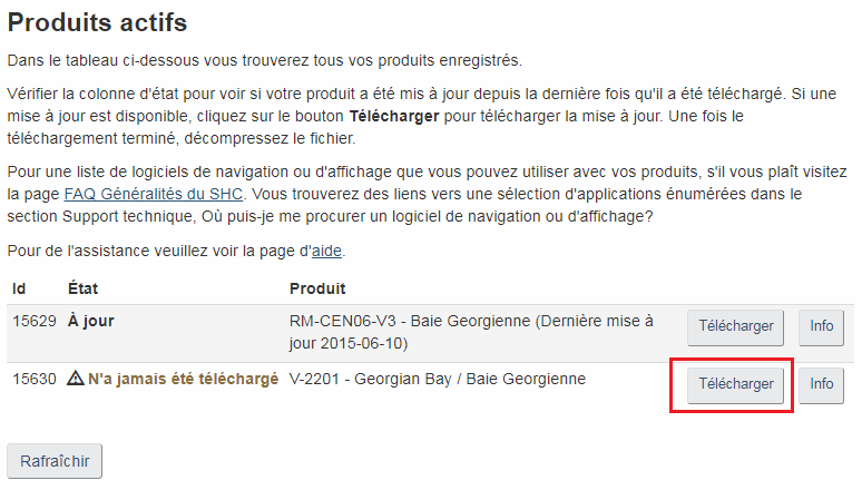 Si vous avez acquis des cartes marines électroniques du Service hydrographique du Canada destinées à la navigation d'un distributeur de cartes agréé, vous pouvez télécharger leurs mises à jour et nouvelles éditions à partir du portail de données numériques du SHC en tout temps, pendant deux années à partir de la date d'achat. Enregistrez-vous dans le portail et téléchargez les cartes mises à jour apparaissant dans votre liste de produits activés.